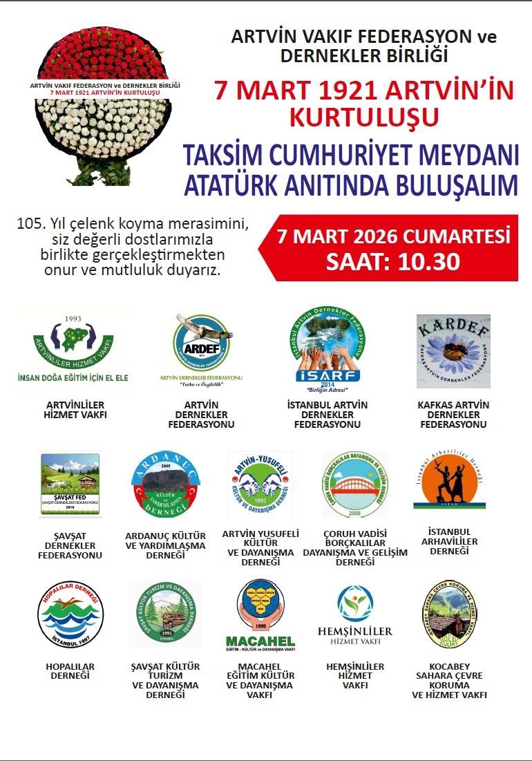 Artvin, 7 Mart 1921’de düşman işgalinden kurtarılarak yeniden anavatana kavuştu. Bugün bu büyük zaferin 105. yıl dönümünü gurur ve onurla anıyoruz. Başta Mustafa Kemal Atatürk olmak üzere, Artvin’in kurtuluşu için mücadele eden tüm kahramanlarımızı saygı, minnet ve rahmetle anıyoruz. Artvin’in kurtuluşunun 105. yılı kutlu olsun. Şavşat Derneği Yönetim Kurulu
